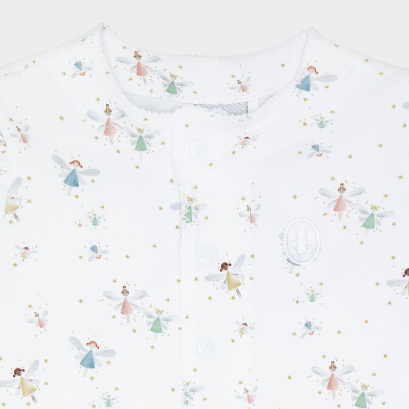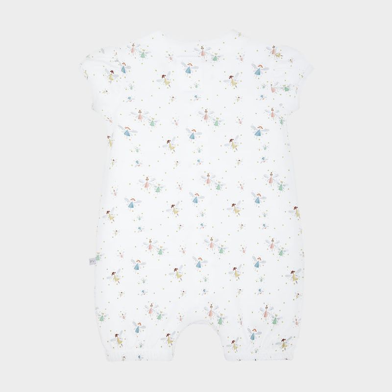 A peça conta com mangas curtas e abertura frontal com botões de pressão, que se estendem até a parte inferior, facilitando a troca de fraldas com praticidade.
