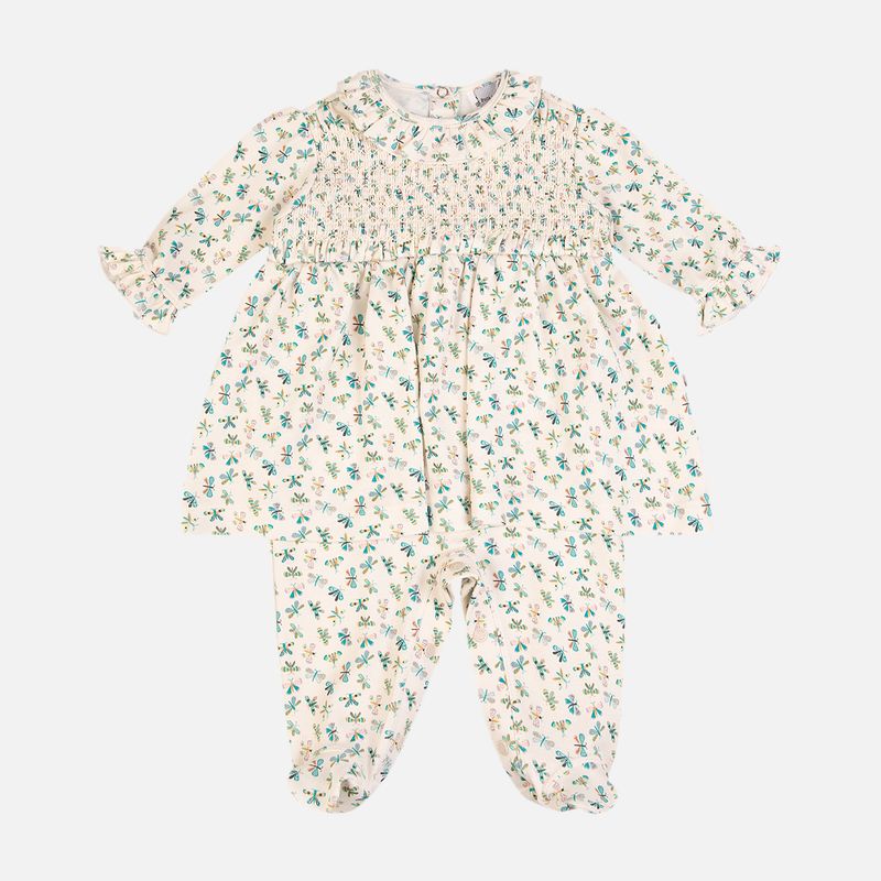 O modelo recebe a encantadora estampa Liberty de borboletas, que aparece em tons suaves e delicados. O destaque fica para o trabalho de smock no peito, que adiciona textura e elegância, acompanhado pelo gola delicada e pelas mangas com babadinhos, criando um visual clássico e acolhedor.