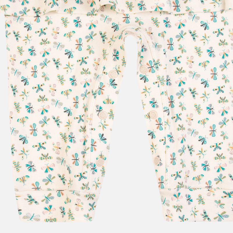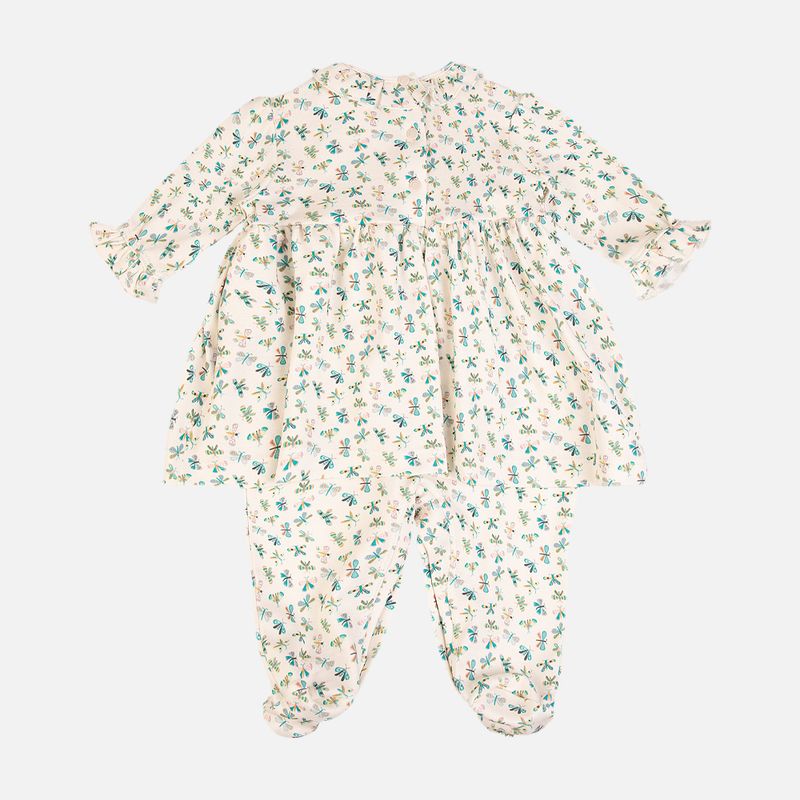Pensado para facilitar a rotina, o macacão com vestido integrado possui botões na parte superior e abertura entrepernas, garantindo praticidade na hora de vestir e trocar o bebê. As perninhas com punho suave completam o caimento, oferecendo liberdade de movimento e muito bem-estar.