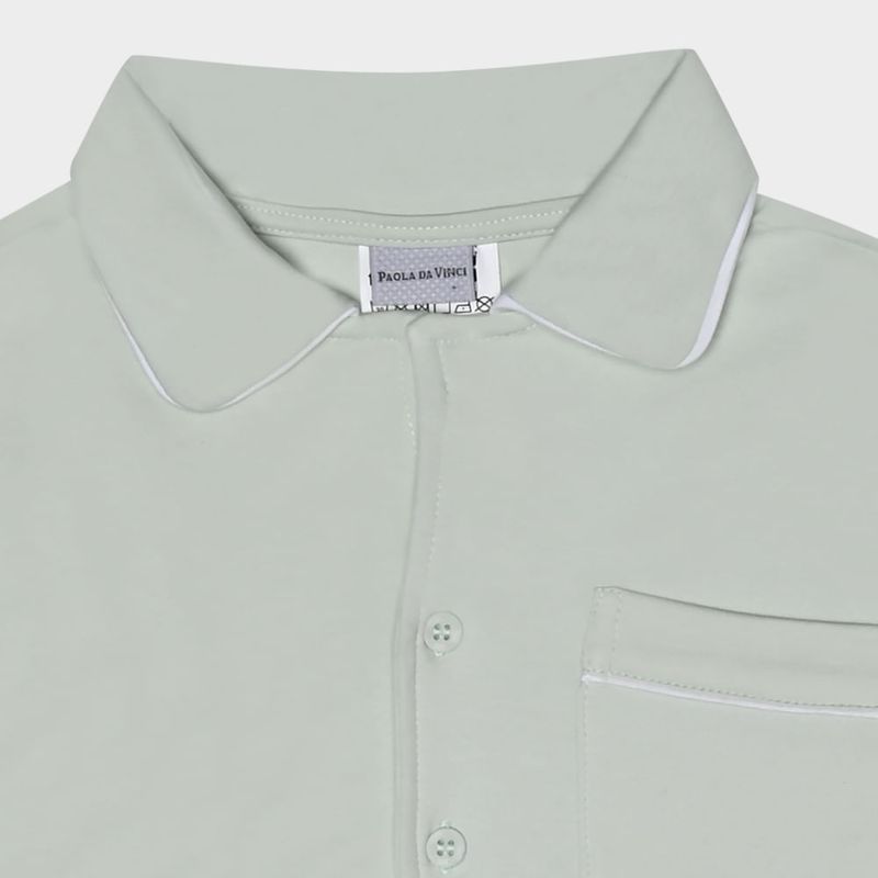 O conjunto traz camisa de manga longa com gola arredondada e bolso frontal, além de calça com cós elástico, que garante liberdade de movimento e ajuste perfeito. Os frisos brancos sutis reforçam o acabamento refinado e atemporal característico da Paola da Vinci, resultando em uma peça elegante, confortável e perfeita para o descanso diário.