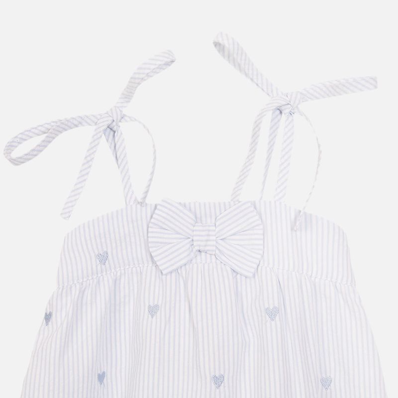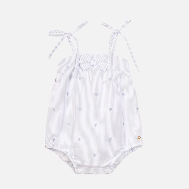 Romper Bebê Ana Ruga Bordado Coração Azul é confeccionado em tecido 100% algodão, garantindo maciez, frescor e muito conforto para a pele delicada do bebê. A padronagem listrada combinada ao bordado de corações azuis cria um visual delicado e acolhedor, enquanto o laço frontal e as alças ajustáveis deixam a peça ainda mais charmosa e prática no dia a dia.