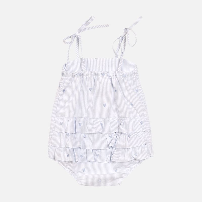 Na parte de trás, os babados franzidos trazem movimento e suavidade ao look, reforçando o estilo clássico da marca. O fechamento com botões de pressão no entrepernas facilita as trocas, oferecendo funcionalidade sem abrir mão da elegância.