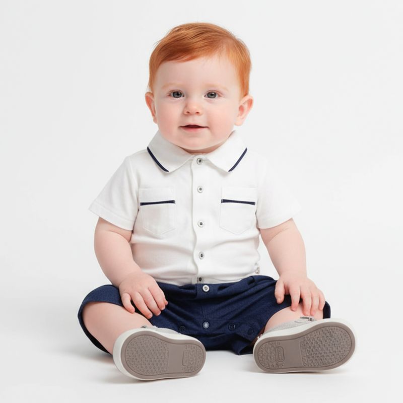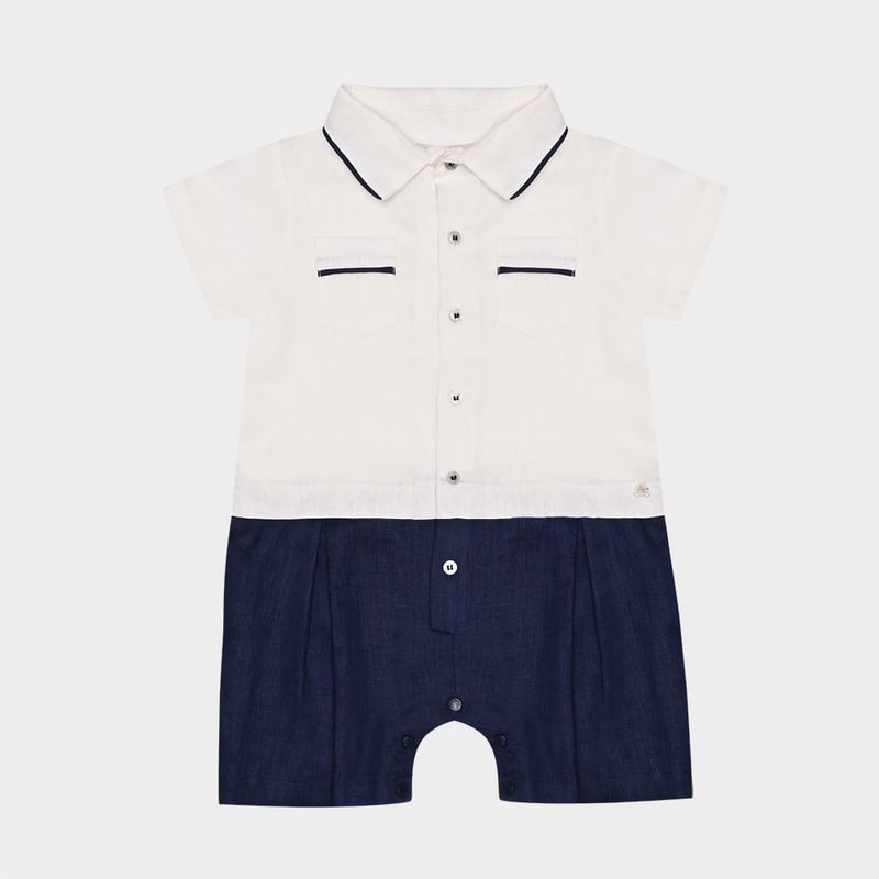 O design bicolor traz a parte superior em tom off white com gola tradicional e detalhe de vivo contrastante, enquanto a parte inferior em azul marinho garante um visual refinado e moderno. Possui bolsos frontais funcionais com acabamento delicado, fechamento frontal por botões de madrepérola e abertura inferior com botões de pressão, que facilitam na hora de vestir e trocar o bebê.