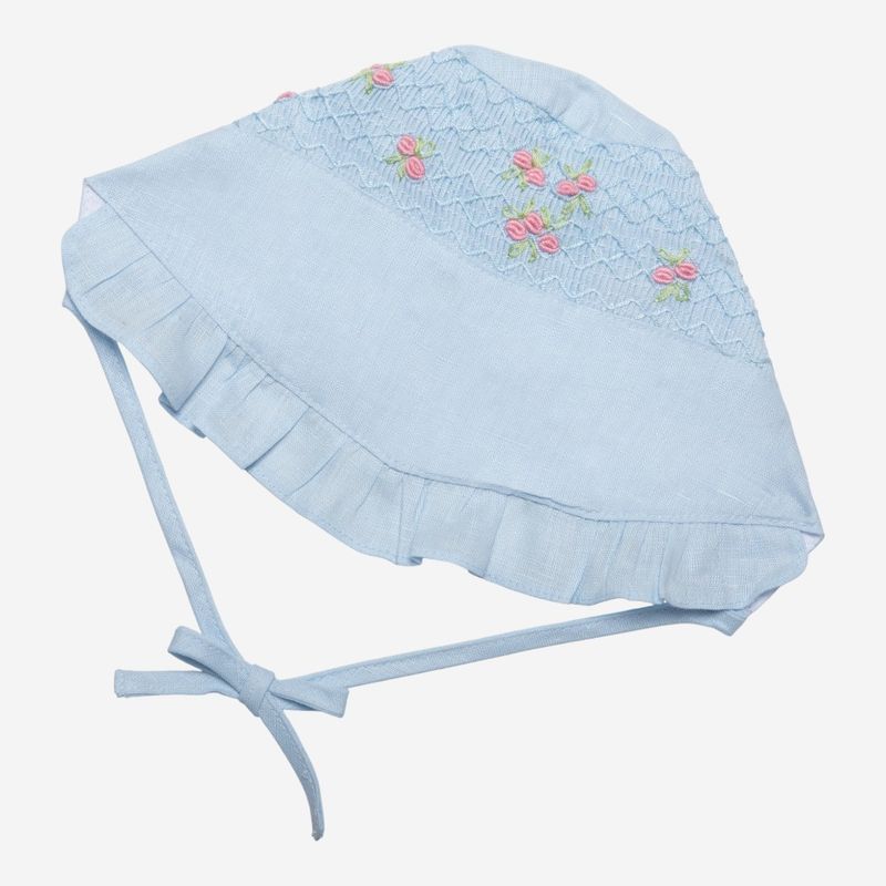 Com gola redonda e mangas curtas, ambas com babados delicados, a peça se destaca pelo bordado em ponto smock na parte frontal, enriquecido com flores artesanais em rococó — um toque clássico e encantador.