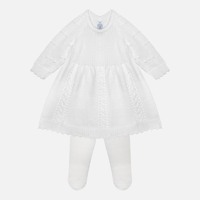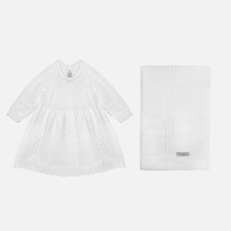 Conjunto vestido bebê em tricô confeccionado em algodão macio, composto por vestido bebê, calça bebê em tricô e manta coordenada, pensado para acolher com conforto e elegância desde os primeiros dias. O toque suave do tricô em algodão envolve o bebê com delicadeza, tornando o conjunto ideal para momentos especiais.