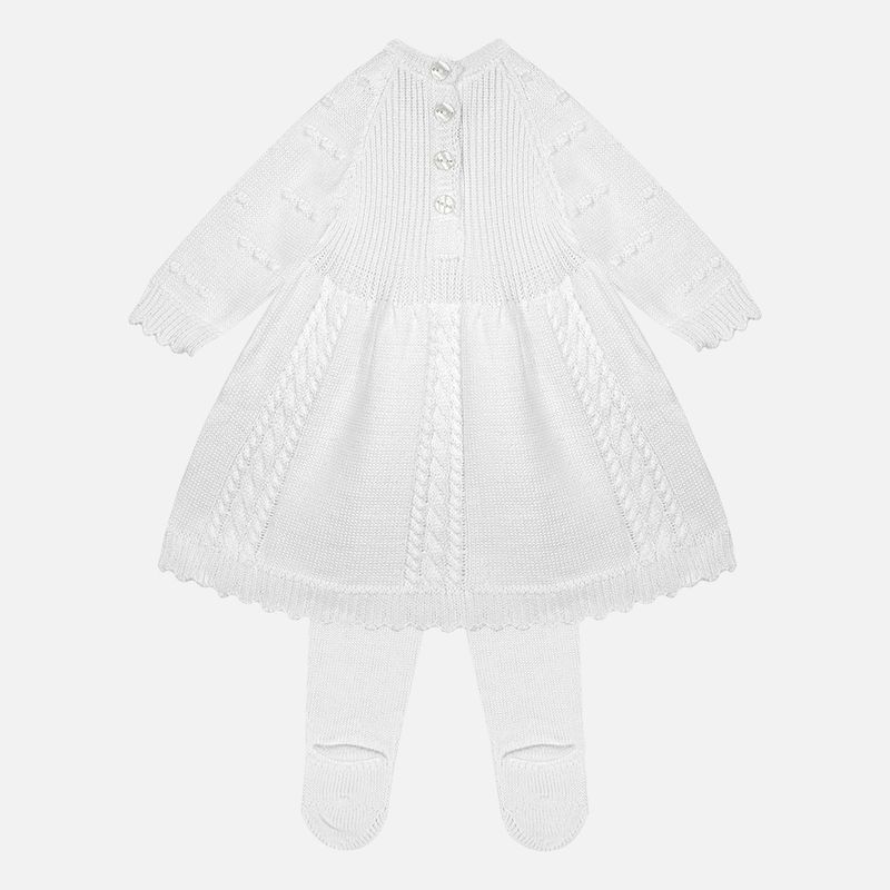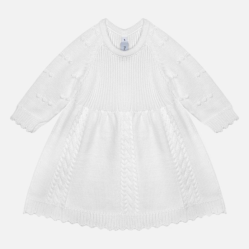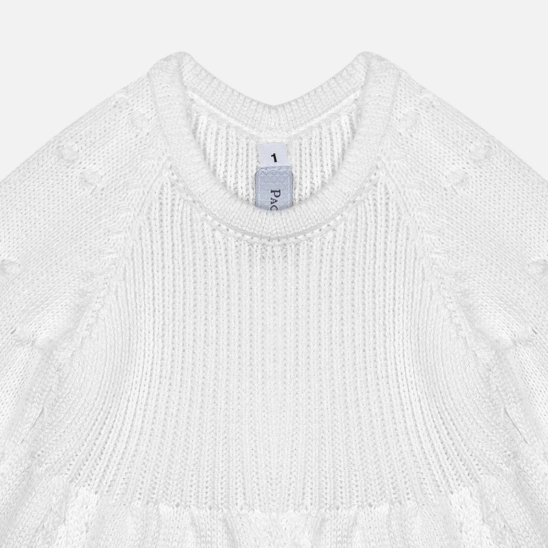 Vestido em ponto 3 tranças com delicadas mangas pipoca, modelagem leve e abotoamento nas costas, facilitando o vestir e valorizando o trabalho artesanal. A calça bebê em tricô garante proteção e liberdade de movimentos, enquanto a manta bebê em tricô completa o conjunto com funcionalidade e charme, perfeita para saídas, visitas especiais e como saída de maternidade sofisticada e acolhedora.