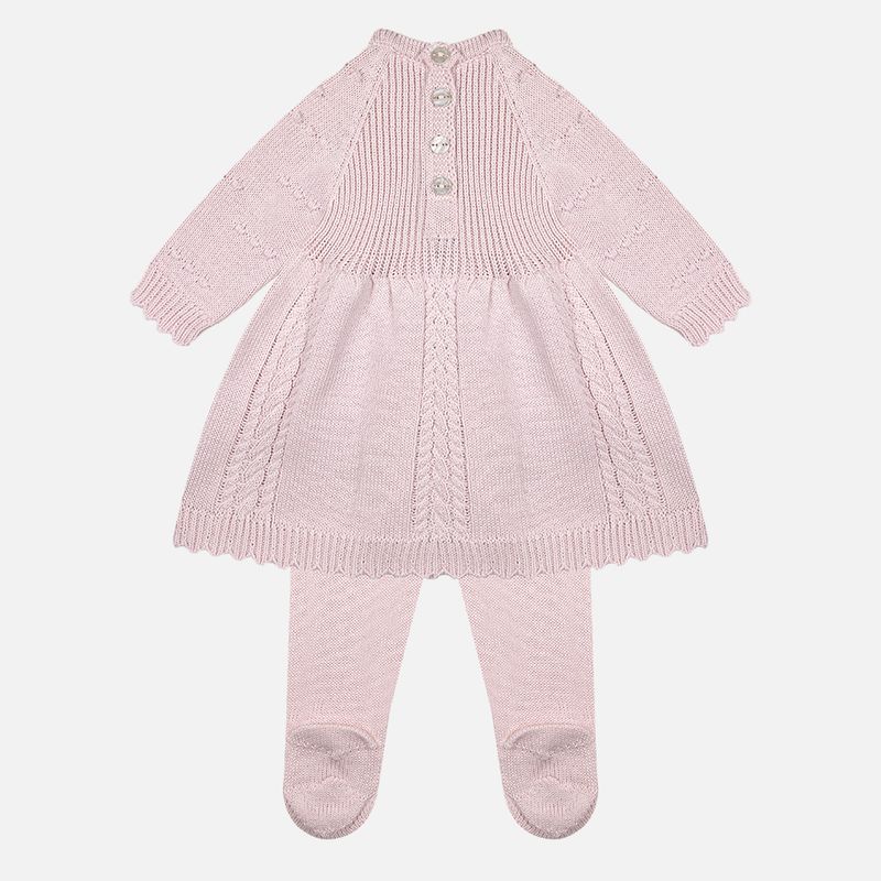 Vestido em ponto 3 tranças com delicadas mangas pipoca, modelagem leve e abotoamento nas costas, facilitando o vestir e valorizando o trabalho artesanal. A calça bebê em tricô garante proteção e liberdade de movimentos, enquanto a manta bebê em tricô completa o conjunto com funcionalidade e charme, perfeita para saídas, visitas especiais e como saída de maternidade sofisticada e acolhedora.