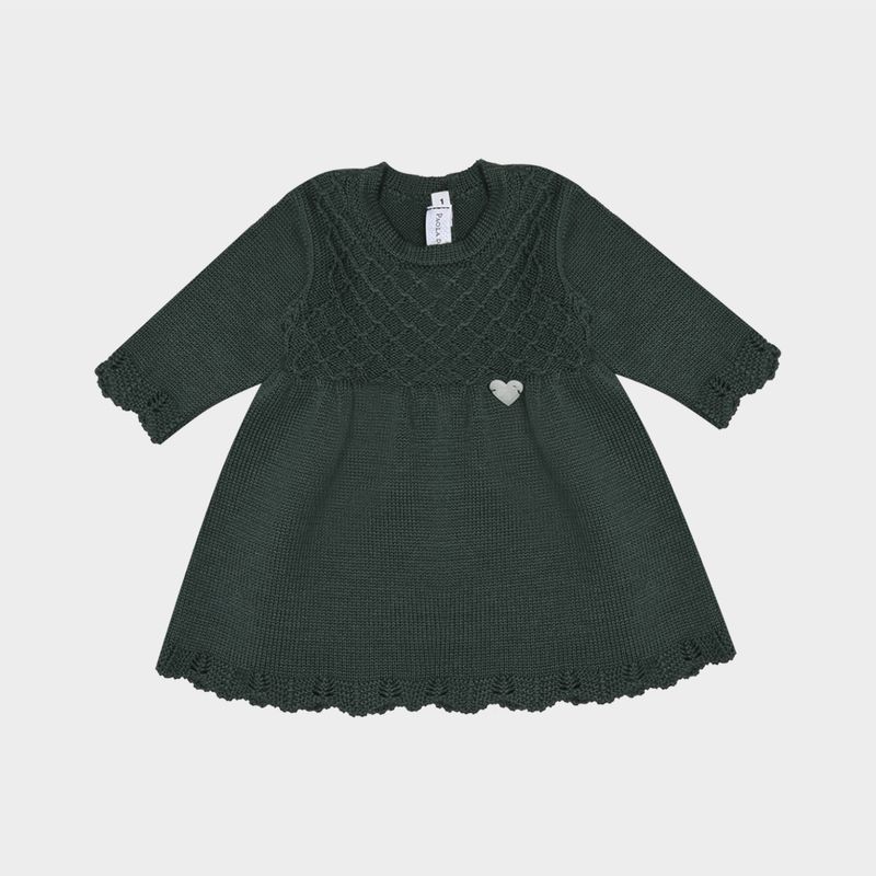 Confeccionada em tricot macio com toque suave, o vestido possui pala trabalhada com pontos losangados, criando um efeito tridimensional encantador. Os acabamentos em bainha ondulada e os detalhes rendados nas mangas valorizam o design artesanal da peça.