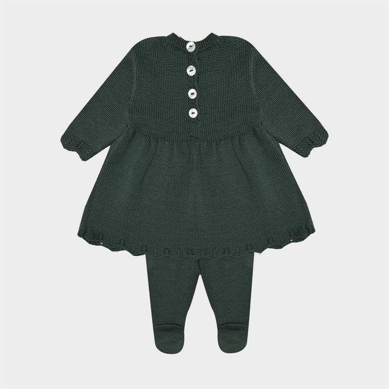 Acompanha calça com pezinhos, que oferece aconchego e liberdade de movimento, enquanto o abotoamento posterior com botões perolados facilita o vestir e garante praticidade no dia a dia.