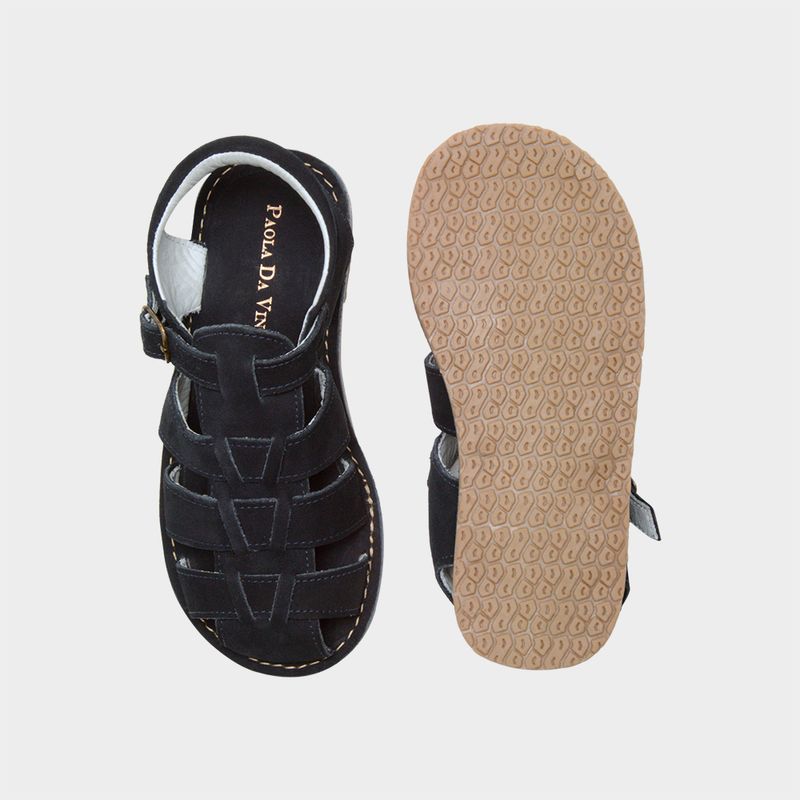Com design clássico e elegante, esta sandália papete em couro legítimo foi criada para acompanhar os meninos com conforto, segurança e estilo. O tom azul-marinho confere um ar sofisticado e fácil de combinar, enquanto as tiras entrelaçadas proporcionam respirabilidade e encaixe anatômico aos pés.