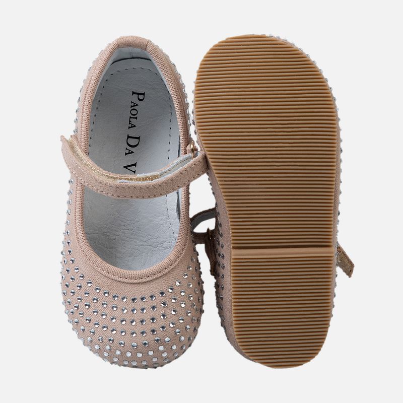 Sapato boneca infantil, na delicada cor areia, desenvolvido para unir conforto e elegância. O acabamento com strass aplicados proporciona brilho sutil e sofisticado, valorizando o visual com delicadeza, enquanto o design clássico reforça a atemporalidade e o cuidado característicos da Paola da Vinci.