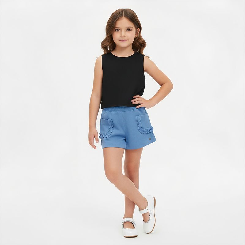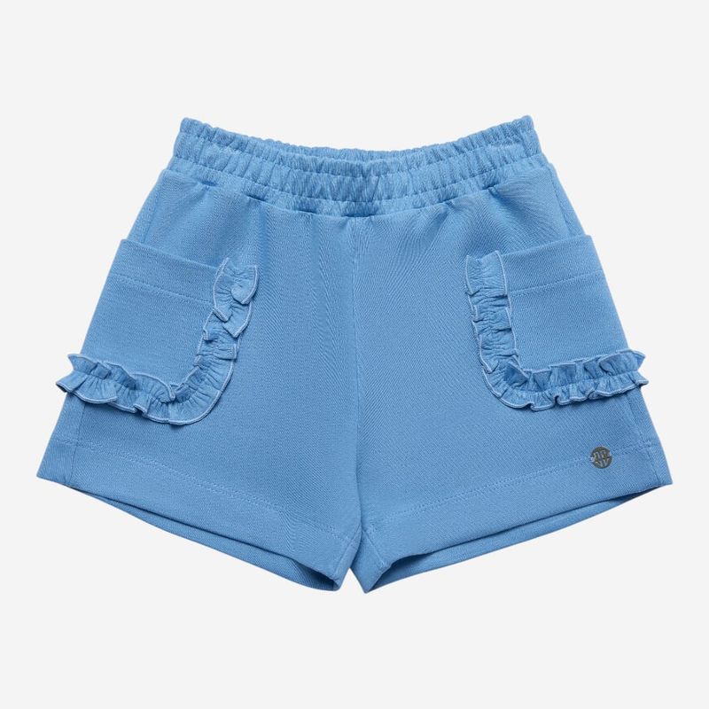 O modelo possui cós com elástico embutido, que proporciona ajuste confortável, e bolsos frontais com detalhe em babado, trazendo um charme extra e acabamento sofisticado. Em tom de azul suave, é ideal para compor produções modernas e delicadas.