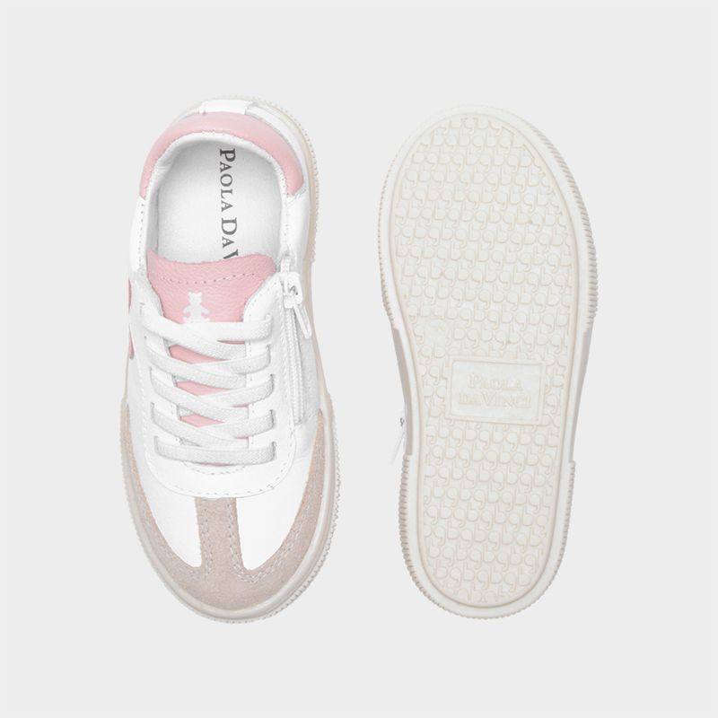 Tênis Toddler Feminino em couro branco e rosa da Paola da Vinci é a escolha perfeita para acompanhar as pequenas com conforto e estilo. Feito em couro macio, ele traz detalhe de coração rosa na lateral, além de bico reforçado em camurça bege, garantindo resistência e um toque sofisticado. O fechamento com cadarço e zíper lateral facilita o calce, proporcionando praticidade no dia a dia.