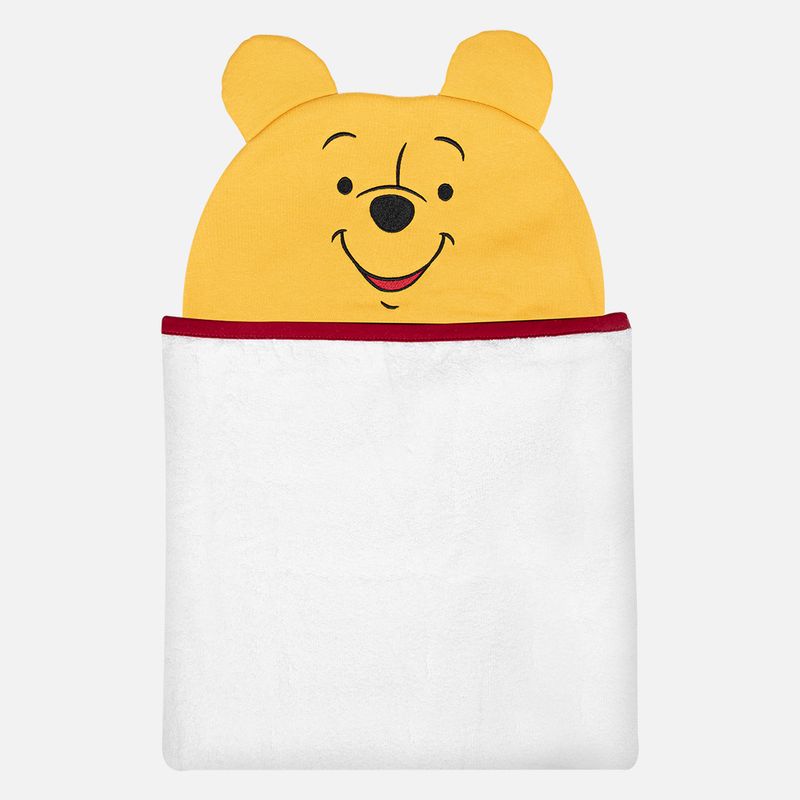 A peça possui capuz com bordado figurativo do Ursinho Pooh, com orelhas aplicadas que reproduzem o personagem de forma lúdica e delicada. Conta ainda com recortes frontais para apoio das mãos e acabamento em viés vermelho nas laterais, trazendo charme e um visual inspirado no universo clássico Disney.