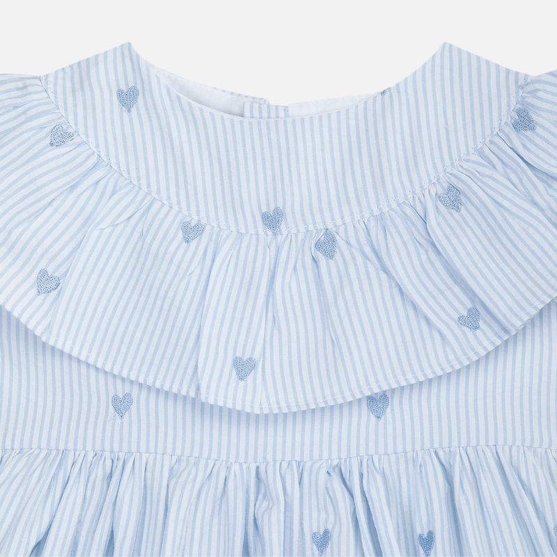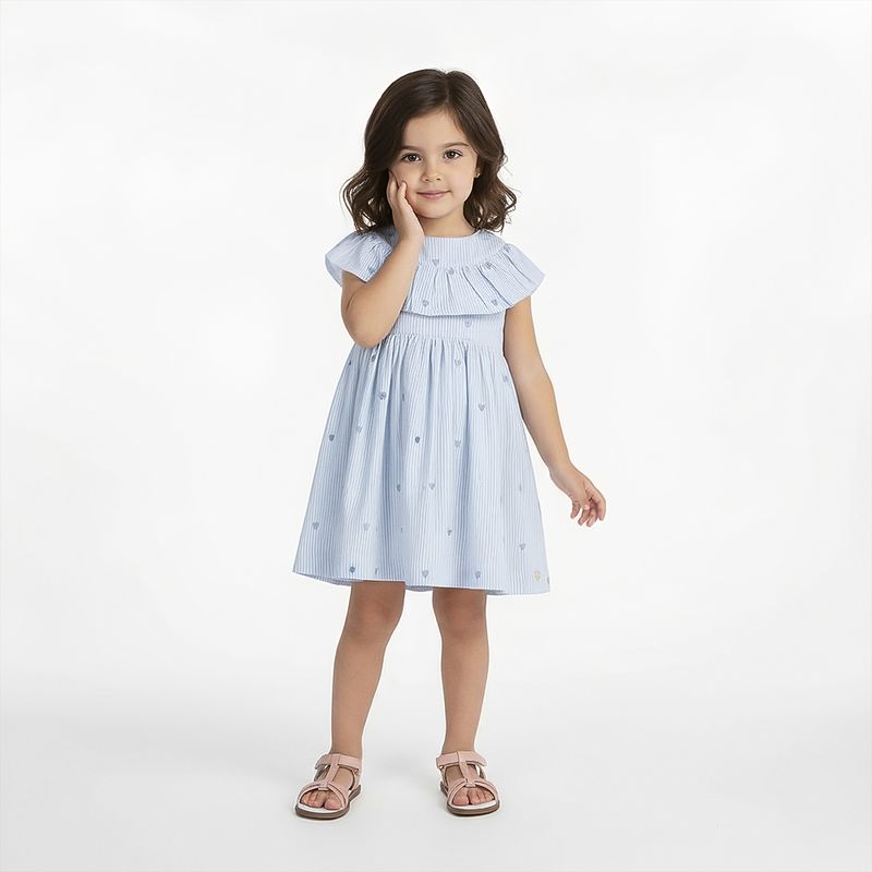 O Vestido traduz a delicadeza e o charme da Paola da Vinci em uma peça repleta de movimento e leveza. Confeccionado em tricoline de algodão macia e respirável, apresenta listras finas em azul e branco com bordados sutis de pequenos corações, que tornam o visual ainda mais encantador.