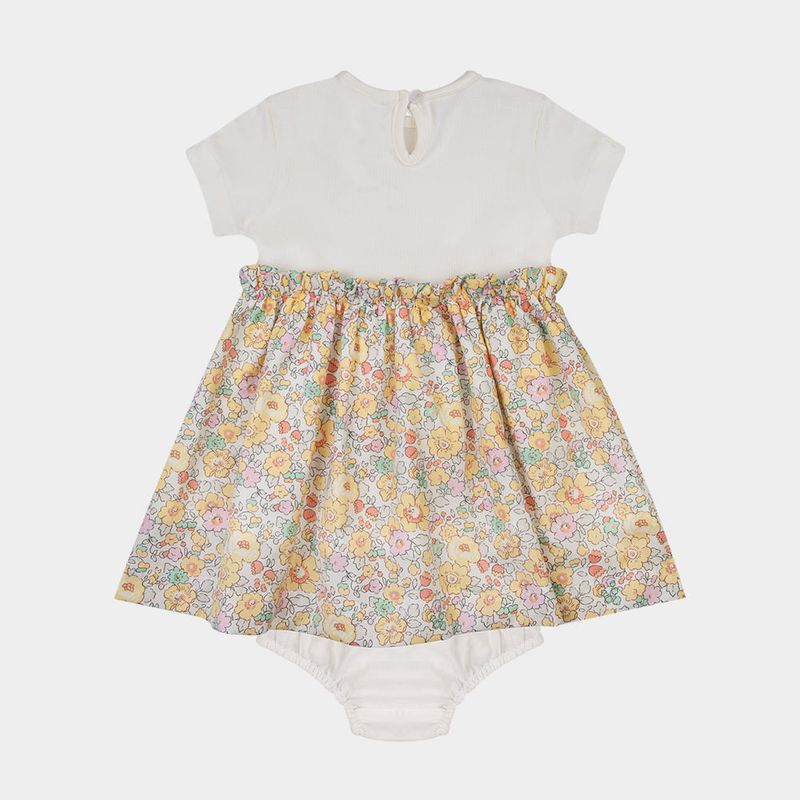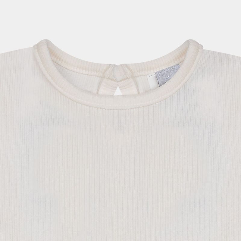 Vestido bebê canelado em tom off-white, confeccionado em malha canelada de algodão, que oferece toque macio, elasticidade suave e conforto para a pele delicada do bebê.