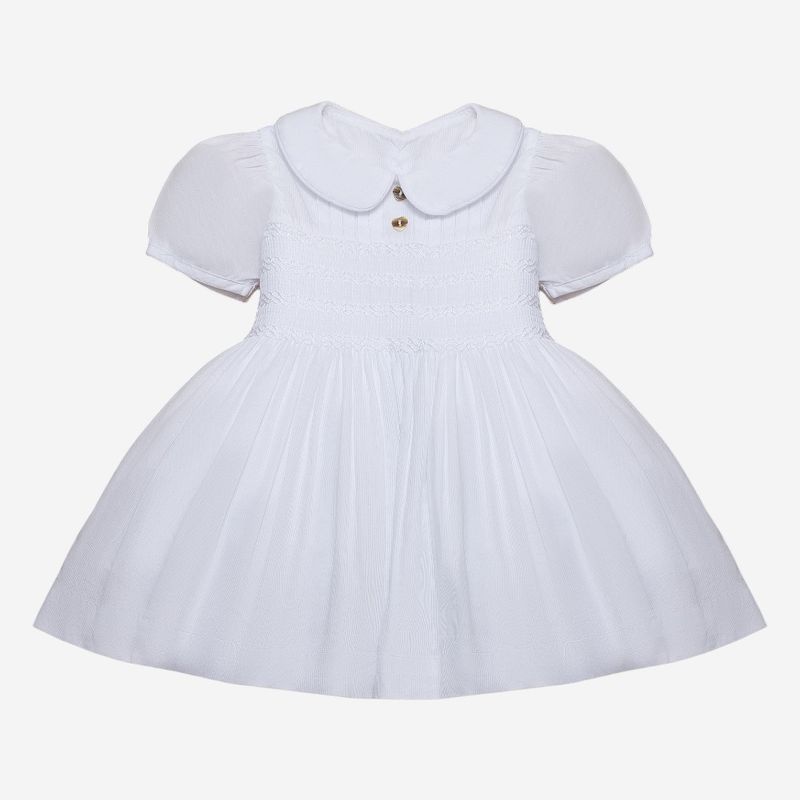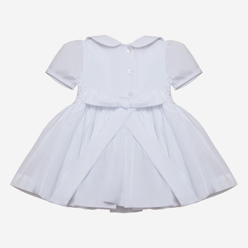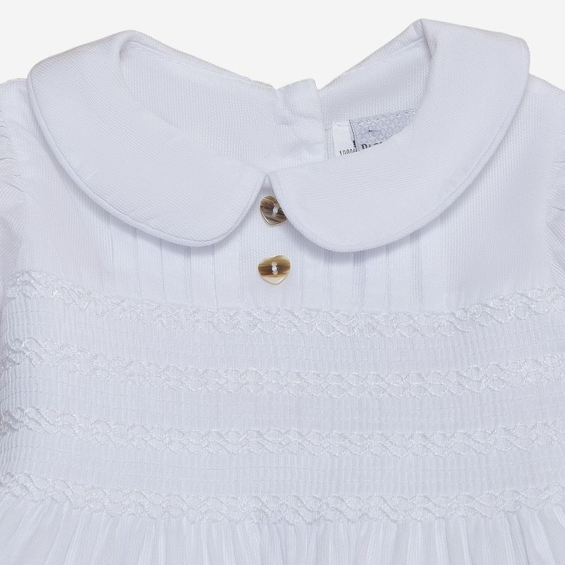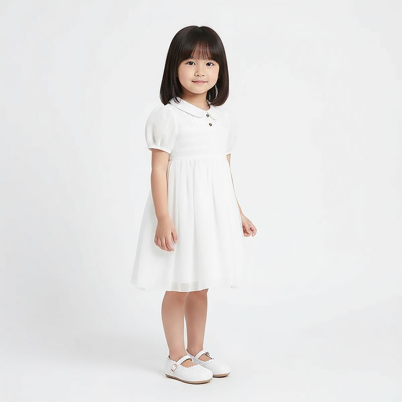 Seu design apresenta gola peter pan arredondada, mangas curtas levemente bufantes e pregas sutis na região da saia, garantindo um caimento impecável. Na parte frontal, o detalhe dos botões em formato de coração traz um toque romântico e delicado, complementado pelo bordado smock no peitinho, que agrega sofisticação artesanal à peça.