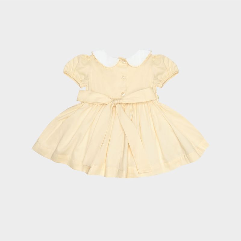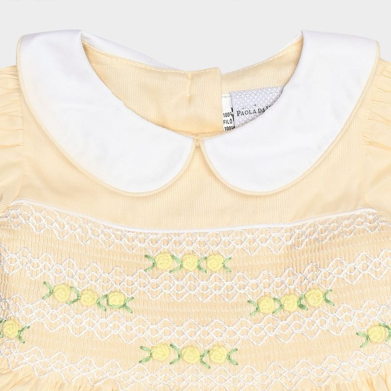 O modelo conta com mangas curtas com elástico, gola peter pan contrastante e faixa para amarração nas costas, que acentua a silhueta com charme. O destaque fica para o bordado smock artesanal com pequenas flores, que adiciona um toque de romantismo e exclusividade à peça.