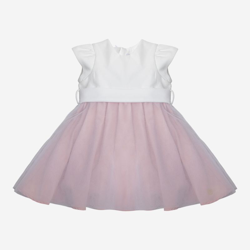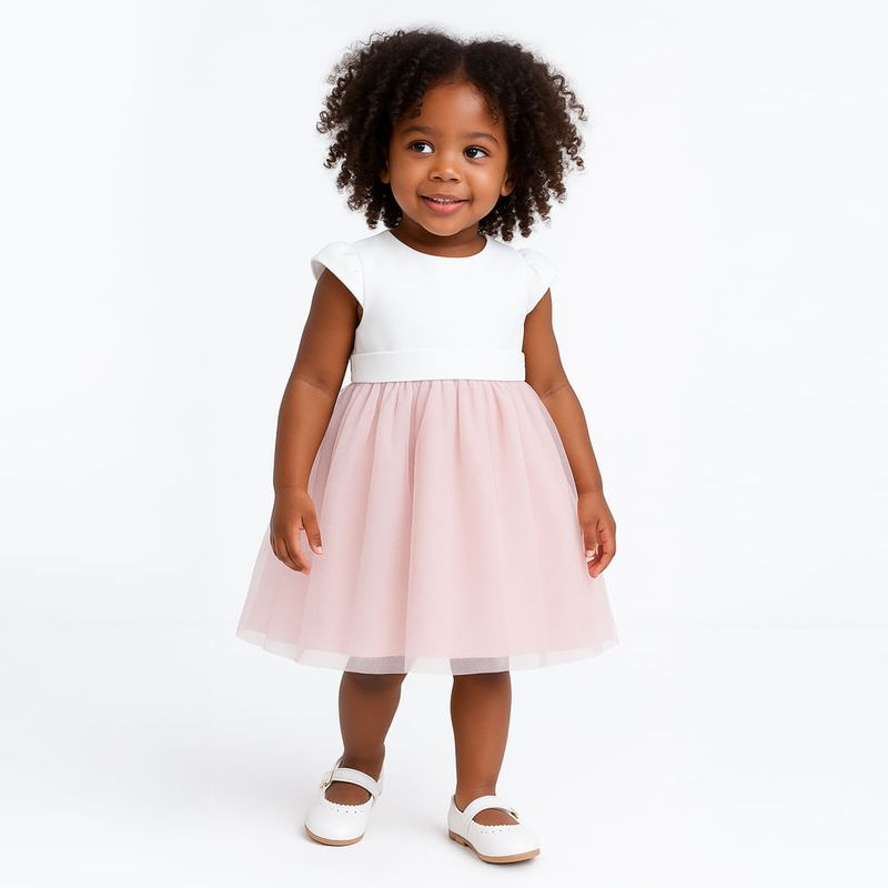 A parte superior em crepe estruturado valoriza a modelagem clássica e traz charme com as mangas suavemente franzidas. A saia em camadas de tule rosé garante movimento, leveza e o volume perfeito para festas e celebrações.