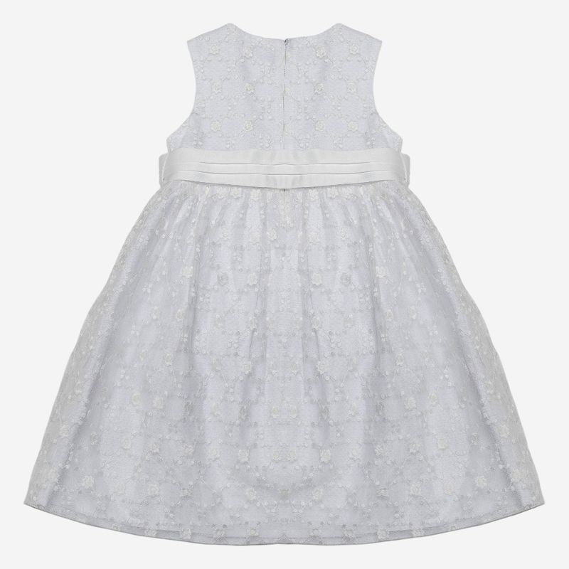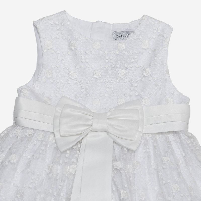A peça possui cintura marcada por uma faixa de cetim com um laço estruturado frontal, que adiciona um toque romântico e atemporal.