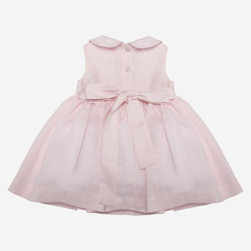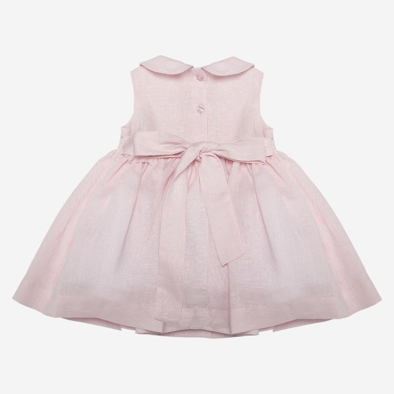 O modelo sem mangas é valorizado pela gola peter pan, enquanto o fechamento em botões e a faixa larga nas costas com laço trazem ajuste perfeito e charme extra. A saia rodada completa o visual com volume suave, ideal para ocasiões especiais.