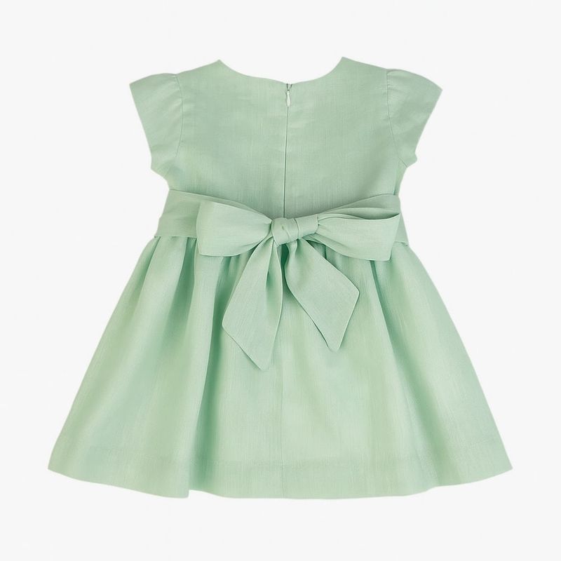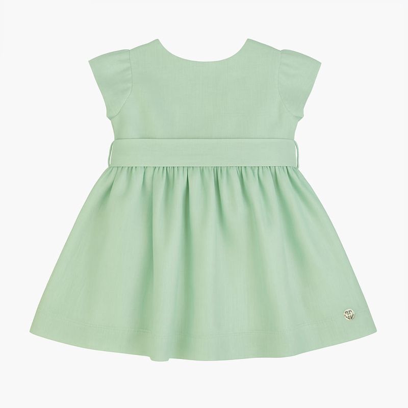 O vestido de bebê em puro linho verde oferece leveza e frescor, colocando o tecido 100% linho em destaque para garantir conforto natural em todas as ocasiões.