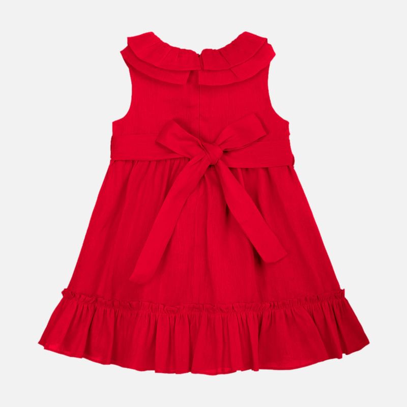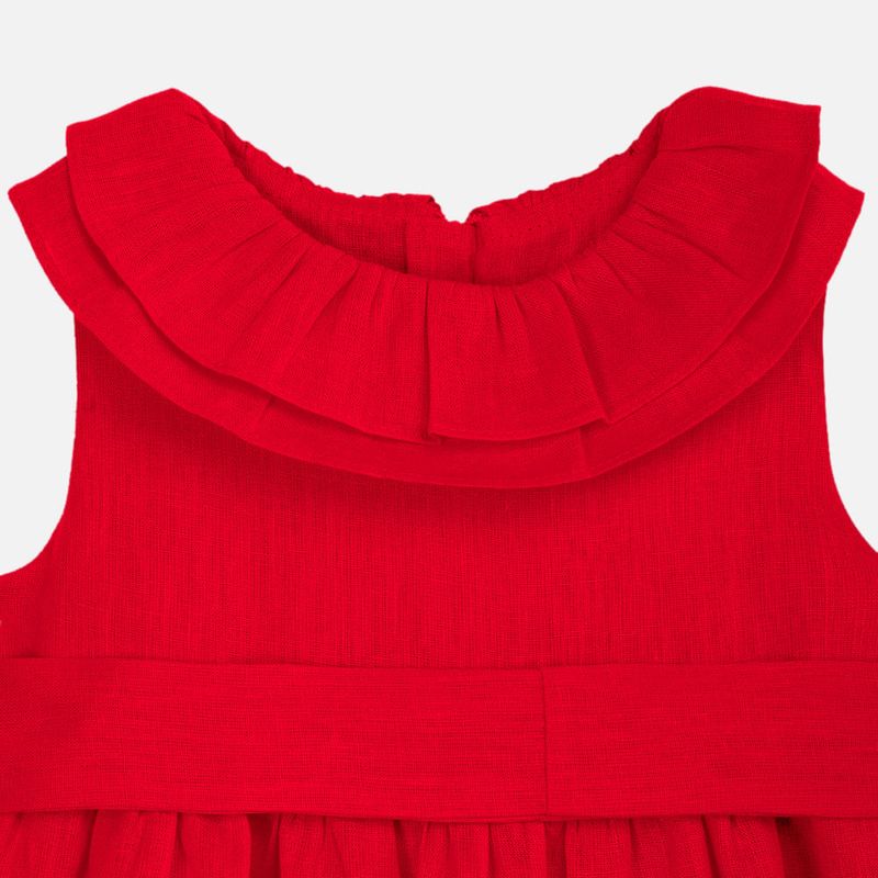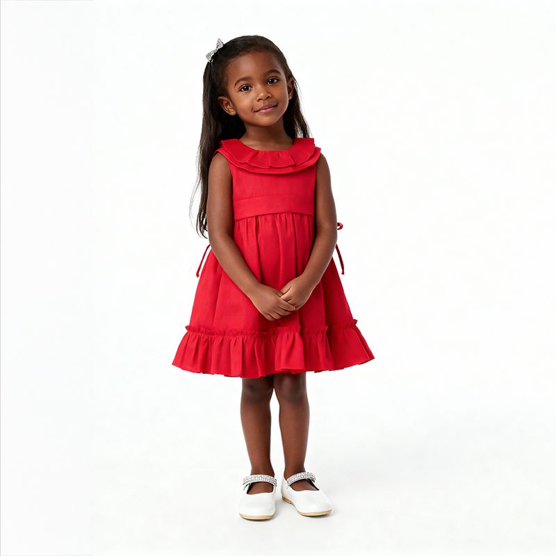 O modelo sem mangas possui gola dupla em babado delicado, que valoriza o acabamento artesanal da peça. A cintura marcada por faixa larga com amarração posterior em laço proporciona um ajuste gracioso, enquanto o barrado com babados franzidos traz movimento e charme extra ao visual.