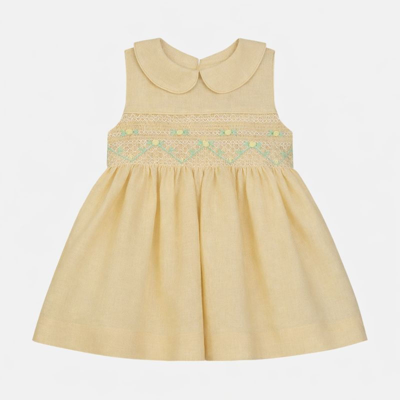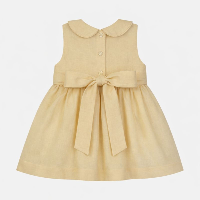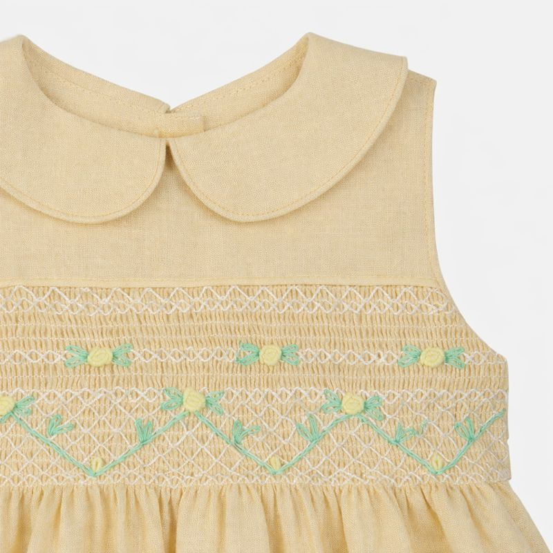 Vestido Bebê Puro Linho Ponto Smock, naturalmente fresco e respirável, oferece conforto térmico e um toque delicado para a pele sensível do bebê. O tecido de linho traz elegância natural e leveza, enquanto o ponto smock bordado à mão no busto valoriza o trabalho artesanal, com delicados detalhes florais.