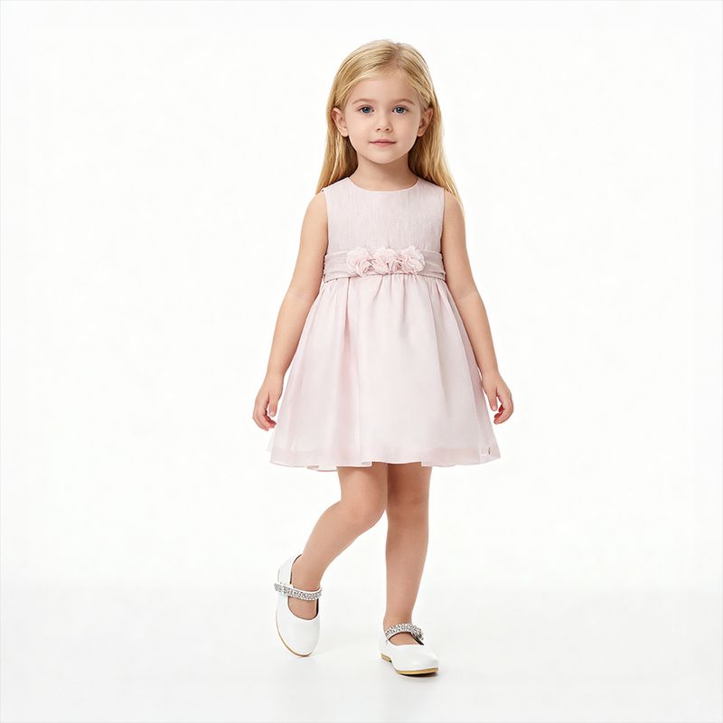 O modelo regata possui cintura marcada com faixa larga e aplicação de flores em tecido, que trazem um charme artesanal e sofisticado à peça. A parte posterior apresenta faixa para amarração em laço, garantindo ajuste perfeito e um caimento gracioso. A saia rodada cria movimento leve e fluido.