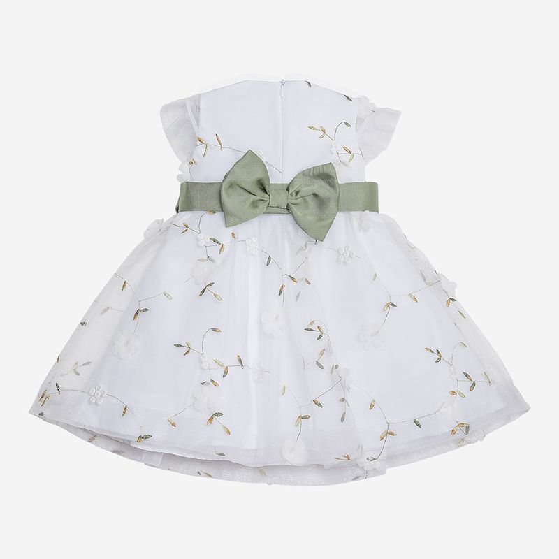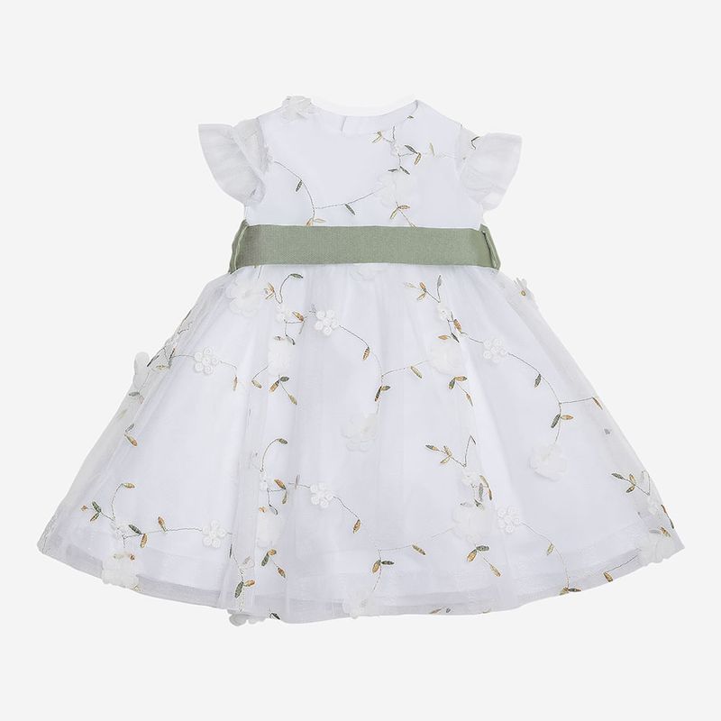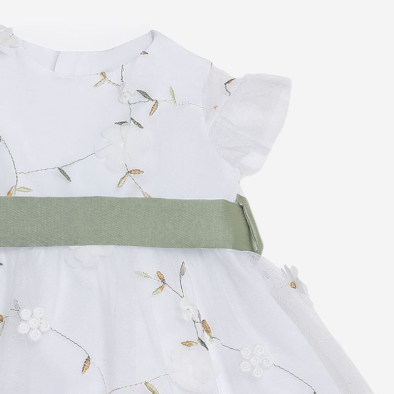 O destaque fica por conta da faixa verde em gorgurão com laço nas costas, que adiciona charme à composição e proporciona um ajuste perfeito à cintura. As mangas curtas com leve transparência e a saia rodada com sobreposição de camadas conferem volume delicado e um caimento impecável. Ideal para compor produções elegantes.