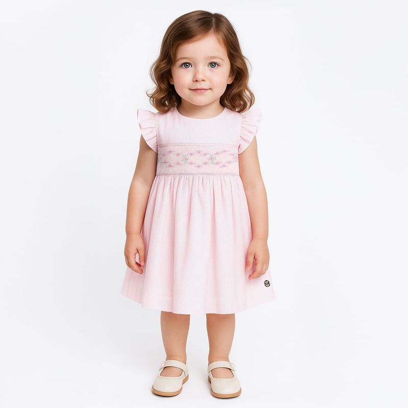 Encantador e atemporal, este vestido de bebê rosa é uma peça delicada que traduz cuidado em cada detalhe. Suas mangas com babadinhos estruturados adicionam leveza à composição.