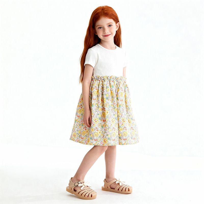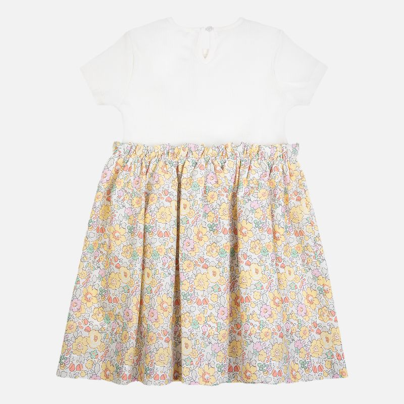 O vestido infantil traz a delicadeza do tecido canelado branco na parte superior, garantindo maciez e aconchego para a pele sensível da criança. Já a saia em tecido Liberty floral, com tons suaves de amarelo, rosa e verde, adiciona leveza e movimento, criando um visual encantador e perfeito para os dias mais frescos. A junção desses materiais proporciona um caimento confortável e elegante, característico do universo acolhedor da Paola da Vinci.