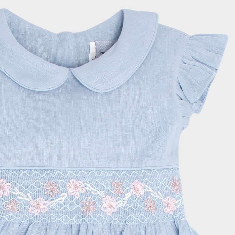 O modelo conta com gola arredondada estilo peter pan, mangas com babadinhos plissados e aplicação de ponto smock bordado manualmente na altura do peito, com flores em tons de rosa e branco.