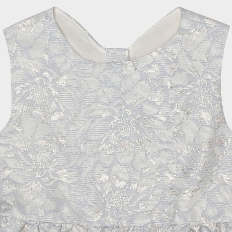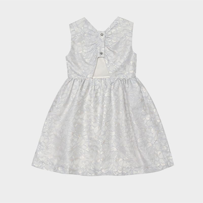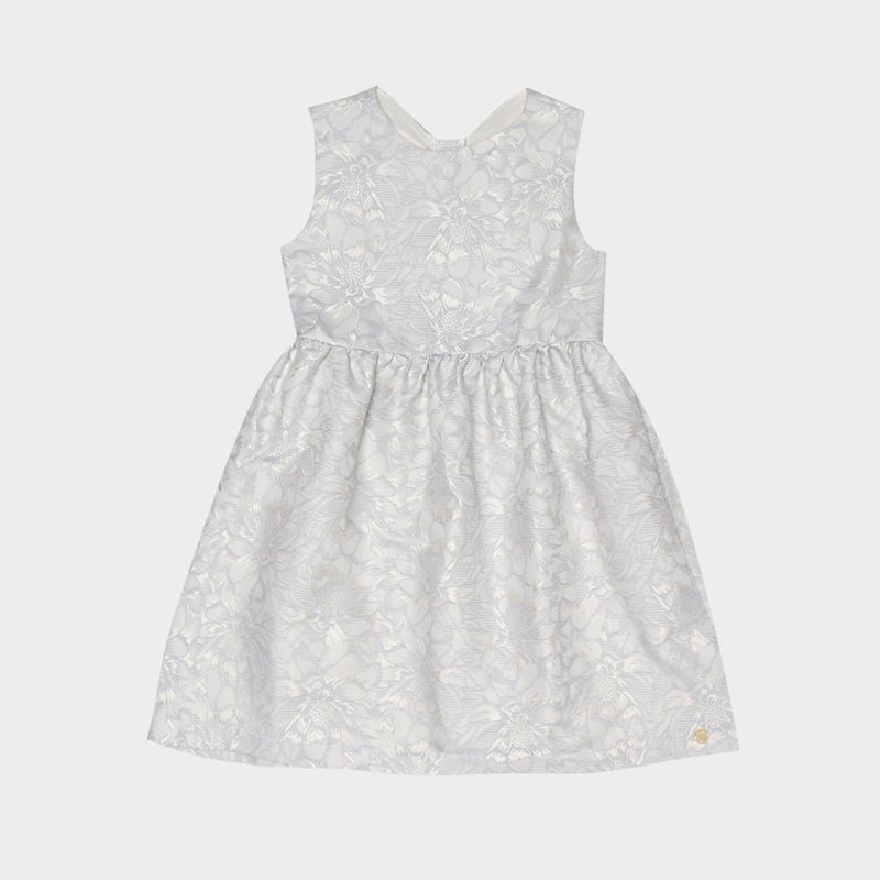 O modelo possui silhueta clássica evasê, sem mangas, garantindo leveza e liberdade de movimento para as pequenas. O detalhe de recorte delicado nas costas adiciona um charme contemporâneo à peça, enquanto o fechamento posterior com botões encapados reforça o acabamento impecável.
