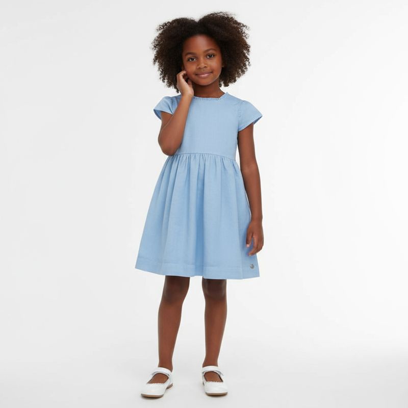 Este vestido infantil feminino apresenta a incrível construção do linho e viscose resultando em um modelo respirável, com fluidez e detalhes sutis. Apresenta acabamento de babadinhos presente na gola e mangas, caimento plissado e abertura prática nas costas por zíper invisível.