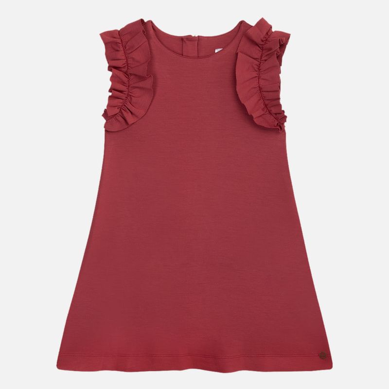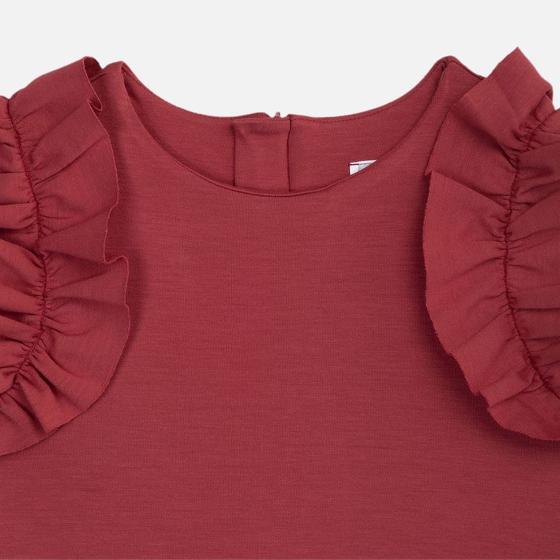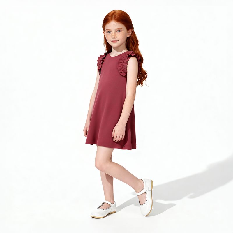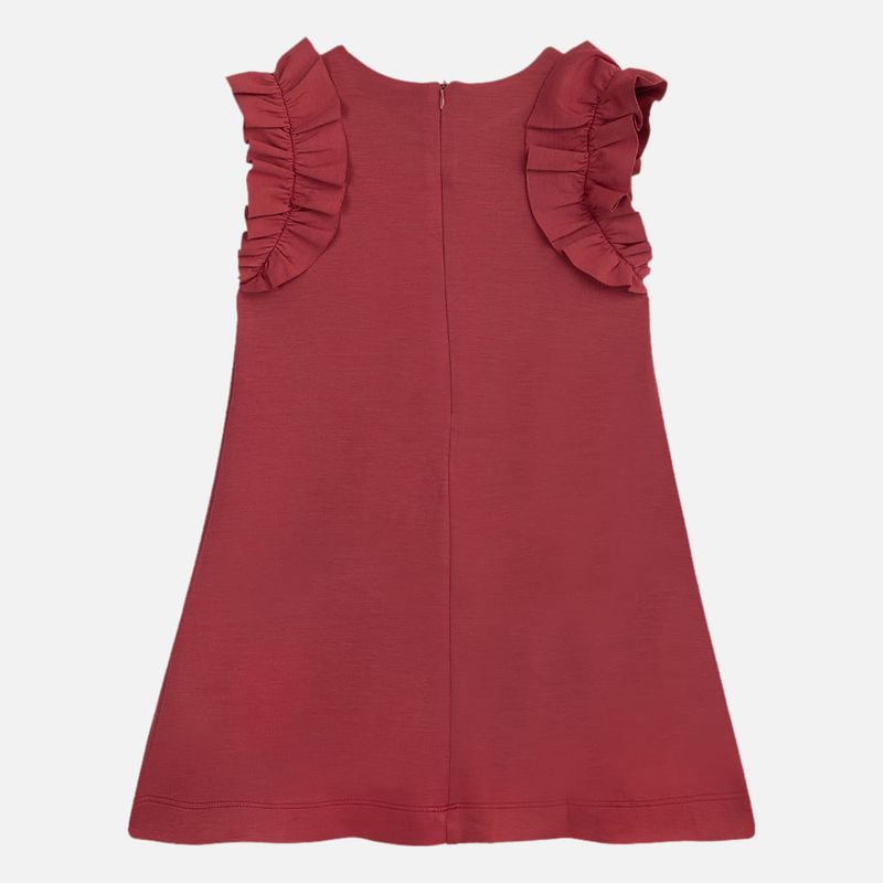 O design sem mangas é realçado pelos babados aplicados nas cavas, que trazem volume sutil e um toque romântico ao visual. A modelagem levemente evasê proporciona fluidez e um caimento impecável, enquanto o fechamento posterior com zíper invisível garante praticidade.