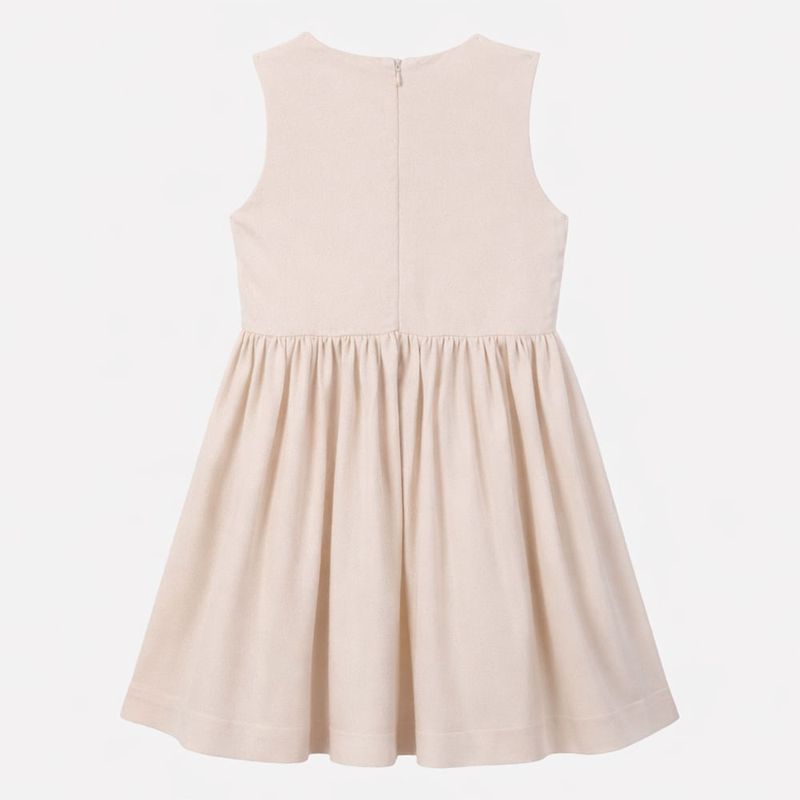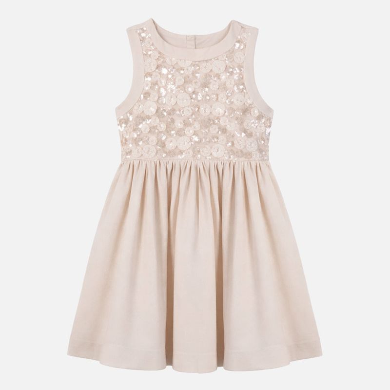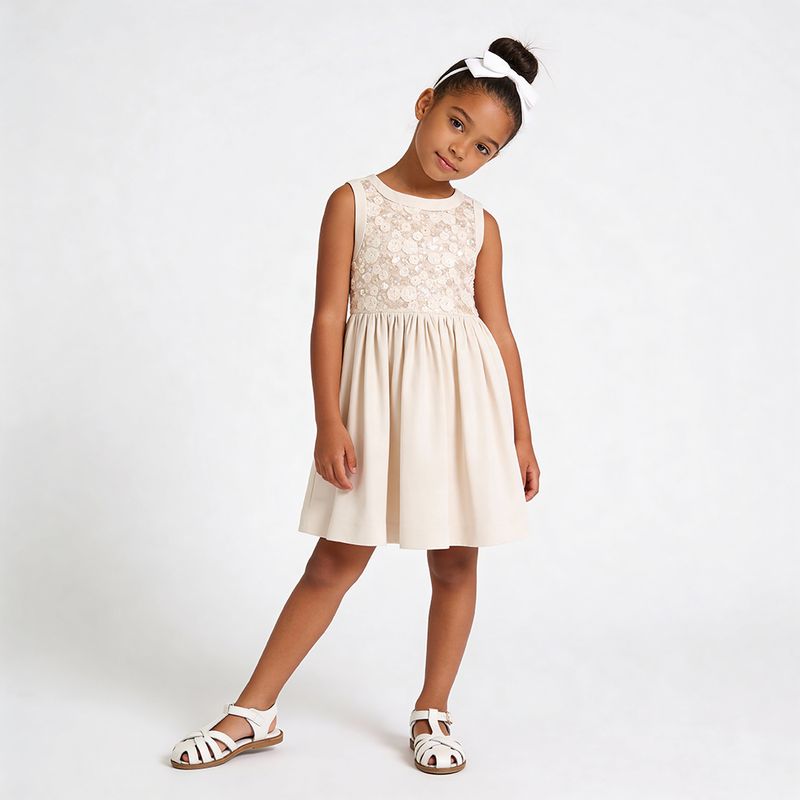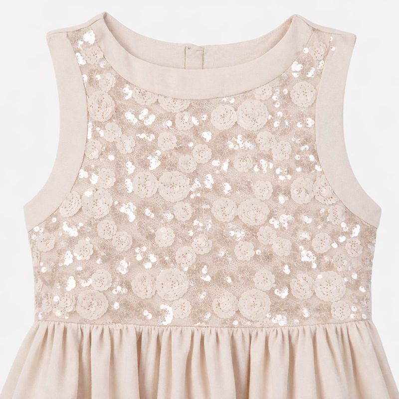 Vestido festa off white com pala em paetê bordado, desenvolvido para ocasiões especiais que pedem elegância e delicadeza. A parte superior em tecido com paetês florais traz brilho suave e sofisticado, enquanto o crepe leve garante conforto e caimento impecável, respeitando a leveza do vestir infantil.