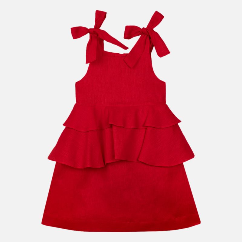 Vestido Puro Linho com Peplum Vermelho em puro linho, elegante e sofisticado, destaca-se pelo toque natural, respirabilidade e conforto térmico ideais para a pele infantil. A cor vermelha traz personalidade e charme à peça, enquanto o tecido de linho garante caimento estruturado e refinado.
