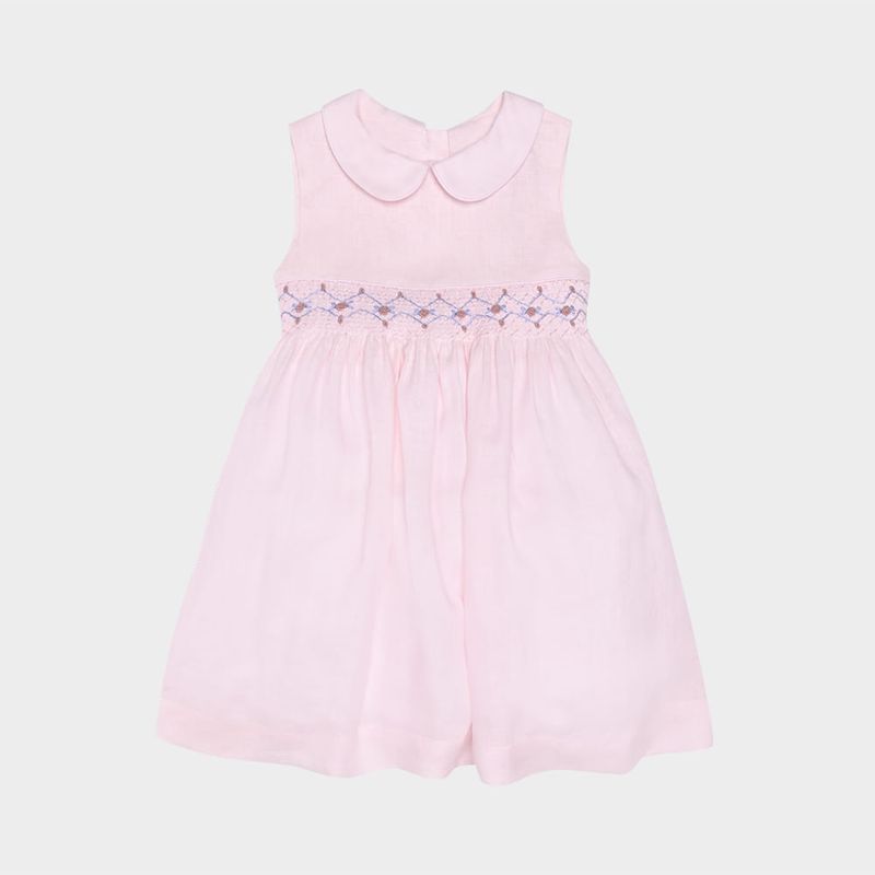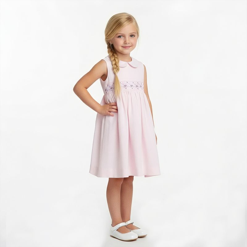 O modelo sem mangas apresenta gola Peter Pan arredondada, um detalhe charmoso que confere ainda mais delicadeza à peça. O destaque fica para o bordado ponto smock artesanal no peitilho, com fios contrastantes que criam um desenho sutil e elegante. Nas costas, o fechamento por botões delicados e a faixa para amarração permitem um ajuste perfeito e um caimento impecável.