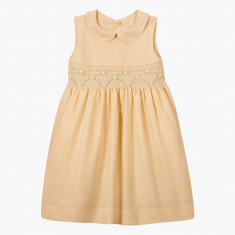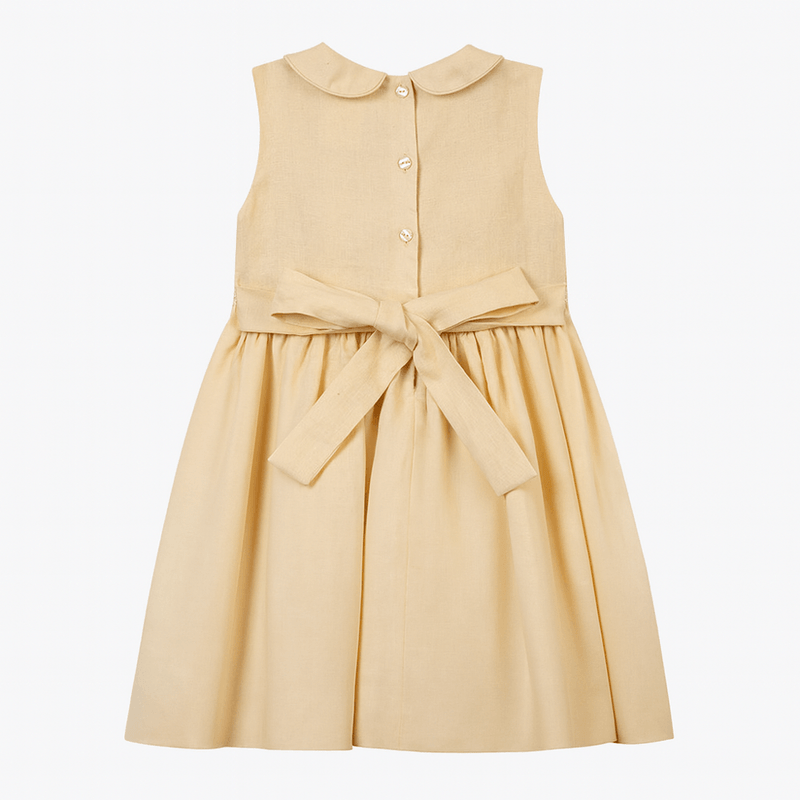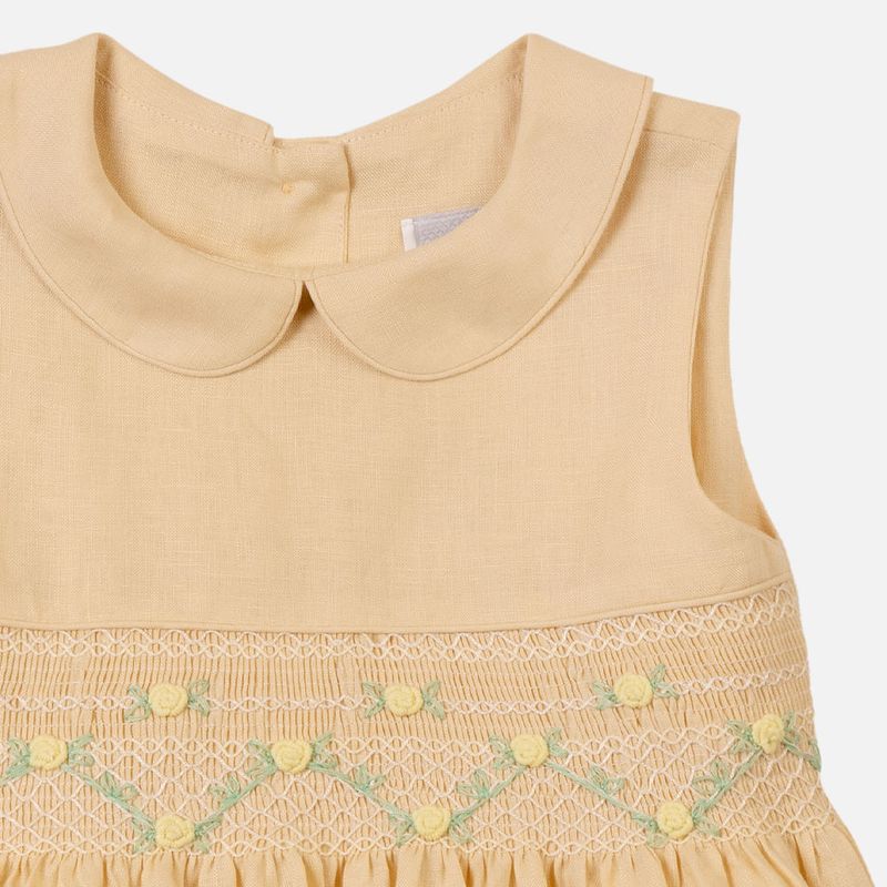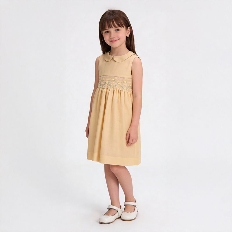 Vestido infantil em puro linho amarelo é a combinação perfeita de frescor, delicadeza e elegância. Confeccionado em 100% linho, um tecido natural, leve e extremamente confortável, proporciona bem-estar para a pele sensível da criança. O tom amarelo suave ilumina o visual, enquanto a gola peter pan reforça o charme clássico e atemporal da peça.
