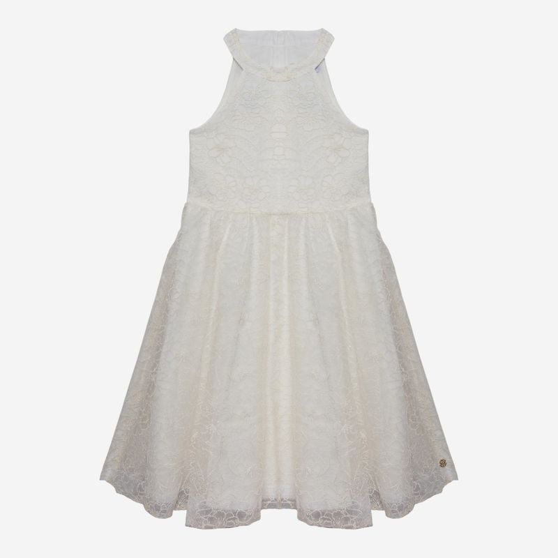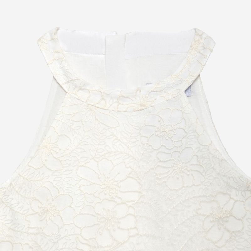 A combinação entre o tom off white e os bordados florais proporciona um visual clássico e atemporal.